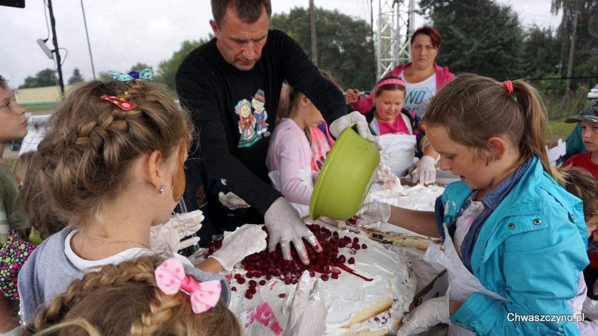 Jacek Miąskowski na poprawę deszczowych humorów upiekł z dzieciakami ogromnego torta, którego każdy mógł spróbować. Najmłodsi uczestnicy dożynek-festynu na kilka chwil zamienili się w prawdziwych cukierników.